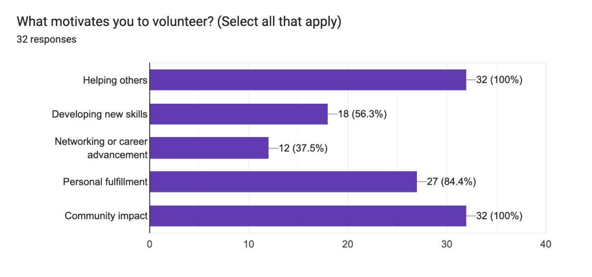 Another key insight involves the role of perceived impact. A significant portion, 37.5%, expressed uncertainty or felt that their contributions had limited effect. This reflects a growing generational expectation that organizations should clearly communicate the outcomes of volunteer work, provide transparency about how tasks connect to broader goals, and offer tangible ways for volunteers to understand the value of their efforts. Students indicated that they are more likely to volunteer when they can see how their work fits into a larger mission and when organizations provide consistent updates about progress or community outcomes.