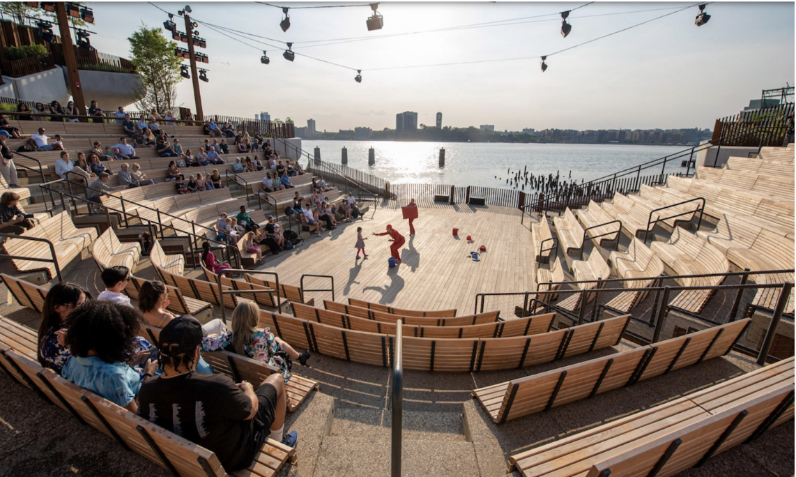 At Little Island, people can walk along the pathways of the park amidst the greenery and view a wide-array of awe-inspiring public art displays. In the book, “The Granite Garden: Urban Nature and Human Design,” Anne Whiston Spirn paints the city and nature as one spectrum with the ends of the scale being urban development and nature which are often pitted against each other. Spirn states, “The city must be recognized as part of nature and designed accordingly. The city, the suburbs, and the countryside must be viewed as a single, evolving system within nature, as must every individual park and building within that larger whole” (Spirn p. 5, 1984). Although urban environments may make humans feel disconnected from nature, Little Island was thoughtfully designed in tandem with nature. Additionally, the park offers programming for all ages which includes the following: dance, thetater, music, comedy, art, and poetry. Little Island also has an open air, wooden-benched amphitheater (known as “The Amph'') which serves as the main performing area for music performances and plays; it seats up to 687 people. A smaller, more intimate stage and lawn space in an area called the Glade hosts additional performances (Hudson River Park).